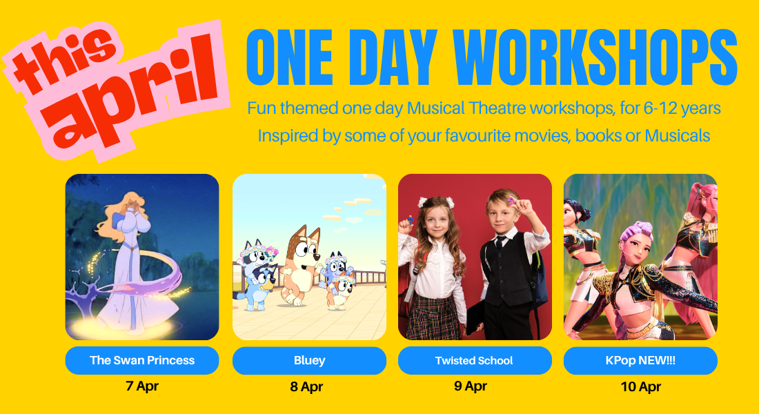 Our one-day workshops are a fantastic introduction to the world of Musical Theatre, they are designed for 6-12 year olds and each day is a new theme. These workshops are musical theatre themed and include singing, dancing, drama and craft activities based on the daily theme. Parents invited to come in at 4:50pm each day to watch the day’s song and dance, and possibly some script or drama activity.